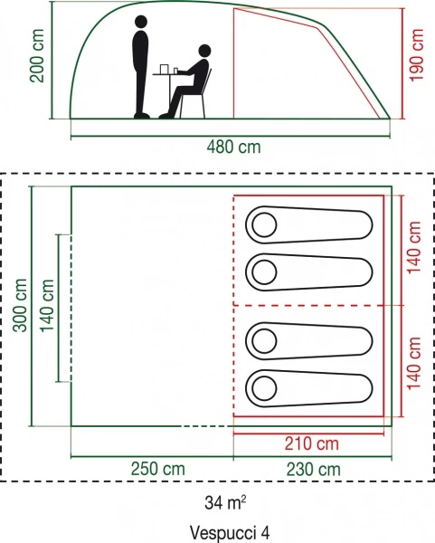 Geräumiges Familien-Tunnelzelt mit großer Schlafkabine (210x280x140 cm – teilbar auf zwei Kabinen mit je 140 cm Breite), Wohn- (250x300x190 cm) und Schlafbereich bieten volle Kopfhöhe. Zwei Eingänge. Das Außenzelt wird zuerst aufgebaut und die Kabinen entsprechend eingehängt.