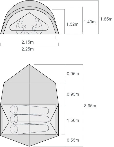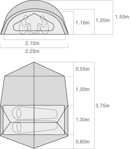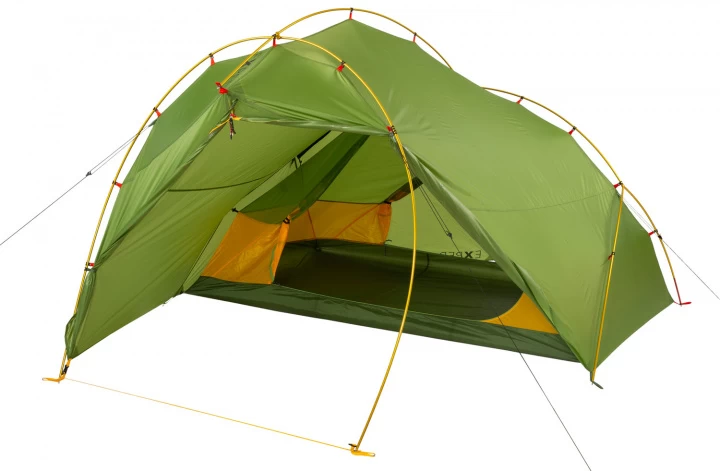 Der großzügige Vorraum bietet Platz für gemütliches Beisammensein, alternativ Platz für ein Fahrrad. Das Vorzelt kann seitlich aufgerollt werden und dient dann als luftiges Sonnendach, das komplette Zelt wird mit Clips an den Stangen eingehängt. 2 Eingänge und 2 Apsiden, Windschutzrand am Innenzelt, einfacher Aufbau – Aussen- und Innenzelt sind miteinander verbunden, Netztaschen am Kopfende.