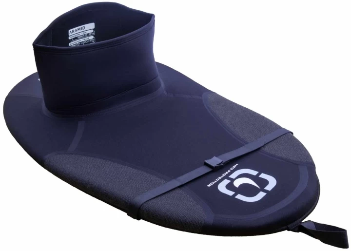 Neoprenspritzdecke mit Aramidkaschierung an den für Verschleiß anfälligen Stellen. Der Innenrand ist mit einer Antirutschbeschichtung versehen um den Kontakt zum Süllrand zu vereinfachen. Schlaufe vorne und Quergurt sind serienmäßig. Die Nähte sind 3-fach geklebt und blindstichvernäht. Der Kamin ist mit einem Smoothskinabschluß versehen.