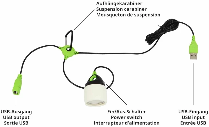 Sehr leichte und kompakte LED-Lampe, die per USB-Stromquelle (z.B. Powerbank) betrieben wird. Die Lampe verfügt über ein 195 cm langes Kabel mit USB-Anschluss, wodurch bis zu 5 Lampen miteinander verbunden werden können. So entsteht im Handumdrehen eine kleine Lichterkette. Mit 200 Lumen bei nur 2 Watt Stromverbrauch ist sie sehr sparsam. Durch das nach unten ziehen des Lampenschirms kann von diffusem auf fokussiertes Licht gewechselt werden. Diese Lampe ist ideal geeignet, um Zelt, Wohnmobil oder Pavillon auszuleuchten. Ein Karabiner zum Aufhängen der Lampe ist im Lieferumfang enthalten.